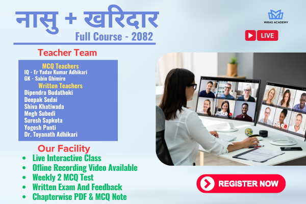लोक सेवा आयोगद्वारा लिइने राजपत्र अनंकित प्रथम श्रेणी (नायब सुब्बा) र द्वितीय श्रेणी (खरिदार) पदको एकीकृत परीक्षा प्रणालीमा आधारित यो विशेष संयुक्त तयारी कक्षामा यहाँलाई स्वागत छ। निजामती सेवामा प्रवेश गर्न चाहने +२ उत्तीर्ण उम्मेदवारहरूका लागि यी दुवै पदहरू उत्कृष्ट अवसर हुन्।